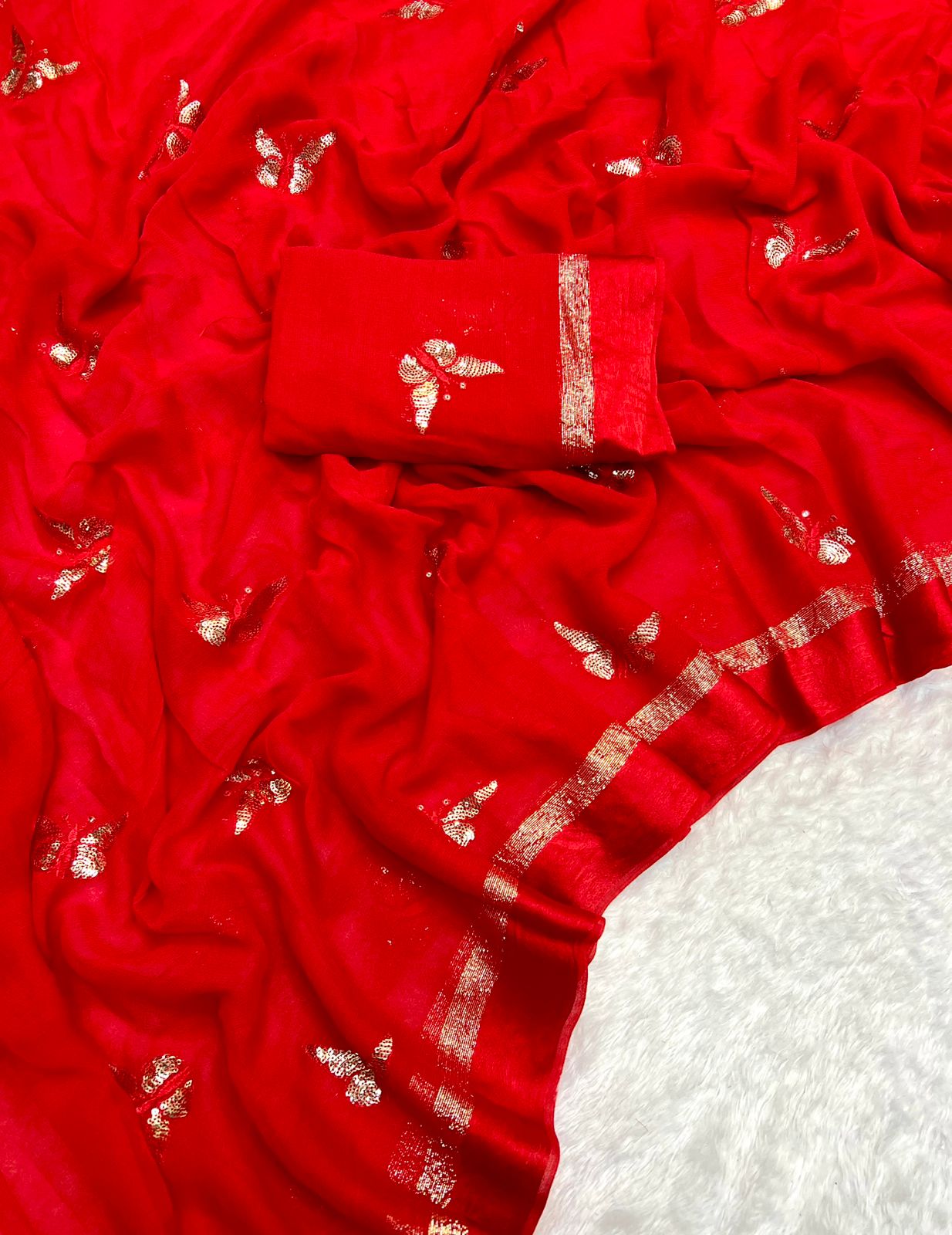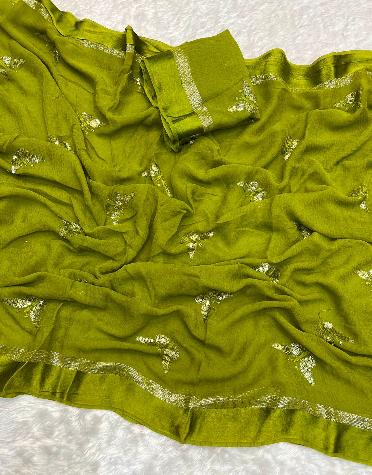 *Fabric* – Satin Patta Pure Viscose Georgette Saree With Fancy Sequins Work & Satin Border With Fancy Contrast Blouse
